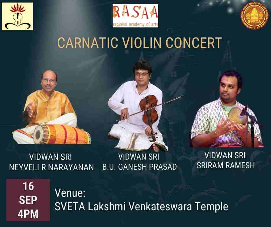 Featured Featured September 16, 2023 @ 4:00 pm - 6:30 pm Carnatic Violin Concert SVETA LV Temple Lakshmi Venkateswara Temple, 18109 NE 76th St, STE#105, Redmond