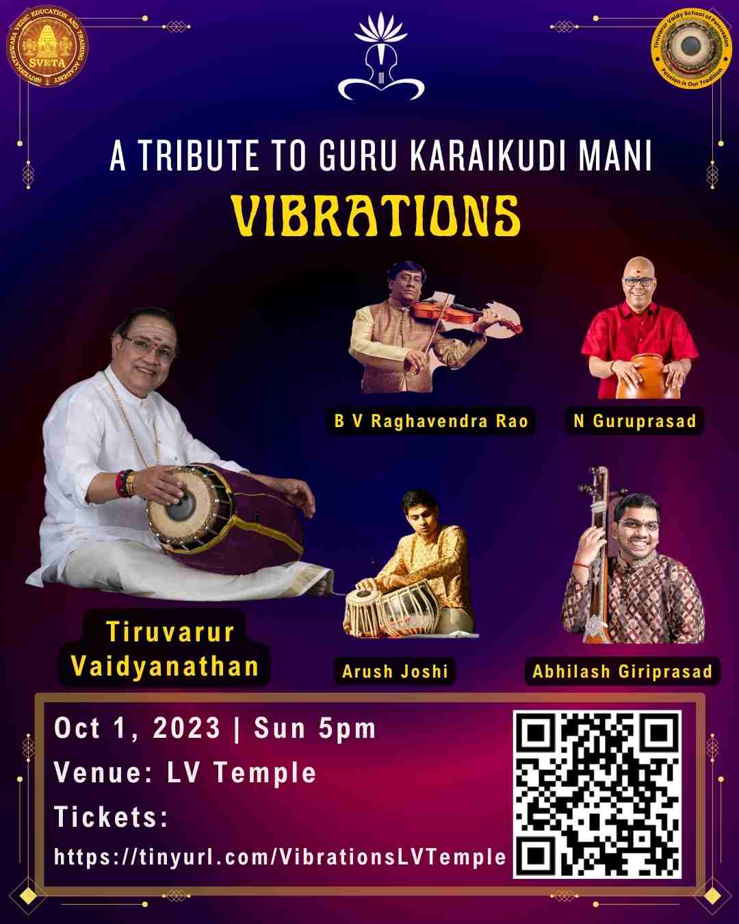 Featured Featured October 1, 2023 @ 5:00 pm - 7:30 pm A Tribute to Guru Karaikudi Mani – Vibrations SVETA LV Temple Lakshmi Venkateswara Temple, 18109 NE 76th St, STE#105, Redmond