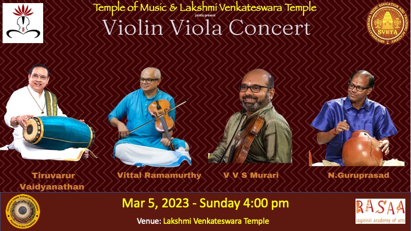 SVETA LV Temple Lakshmi Venkateswara Temple, 18109 NE 76th St, STE#105, Redmond, WA, United StatesEvent by Temple of Music and SVETA LV Temple Violin - Vittal Ramamurthy Viola - VVS Murari Mridangam - Tiruvarur Vaidyanathan Ghatam - N Guruprasad Tickets available on Eventbrite www.eventbrite.com/e/violin-viola-concert-by-vittal-ramamurthy-and-v-v-s-murari-tickets-531442618177